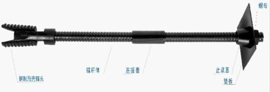 由鋼制漲殼錨頭、中空注漿錨桿體、止?jié){塞、墊板、螺母和連接套組成。